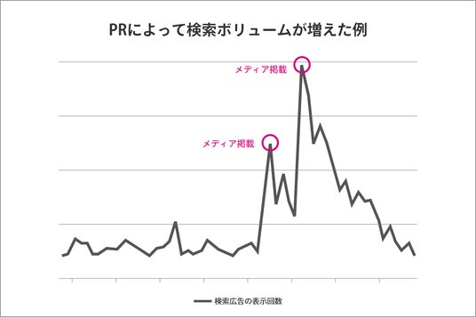 PRは、メディア露出の不確実性が高く、発信内容やタイミングのコントロールが難しい反面、効果的な施策を実施することでテレビやインターネットメディアで取り上げられた際には、検索ボリュームが普段の数倍・数百倍となるケースが多数あります。商材によっては、これまで主流だったマス広告などの認知施策に比べ費用対効果よく獲得に繋がる可能性があると考えており、自然検索やSNSなどの広告施策以外の面においても長期的な流入が確保できます。