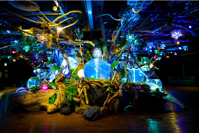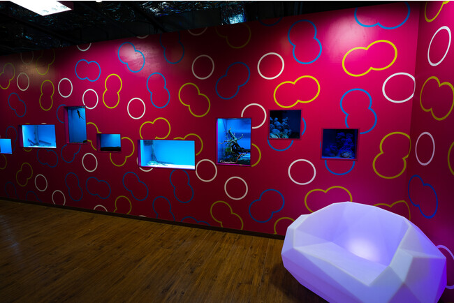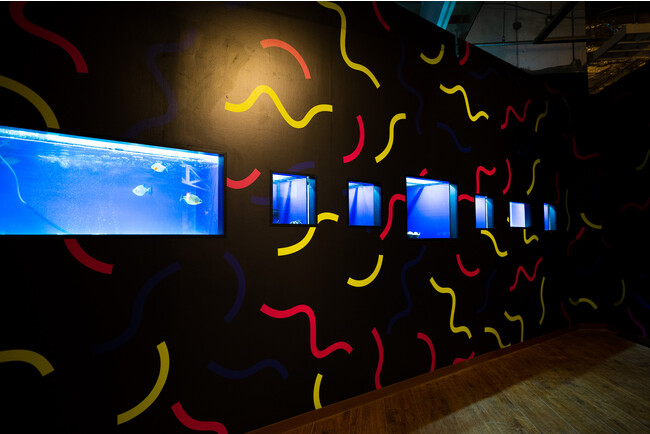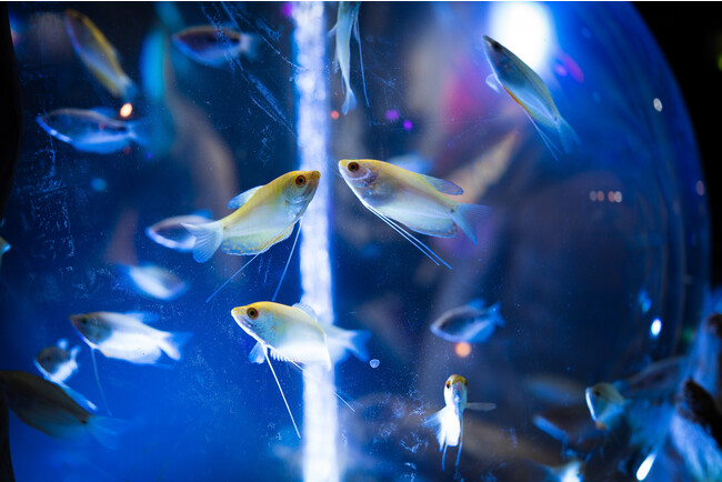 可愛らしい見た目をしたウーパールーパーをメインに、半球のアクアリウムの中に、ぷるぷるを感じられる熱帯魚たちを混泳させ、可愛い生き物の惑星をイメージしています。