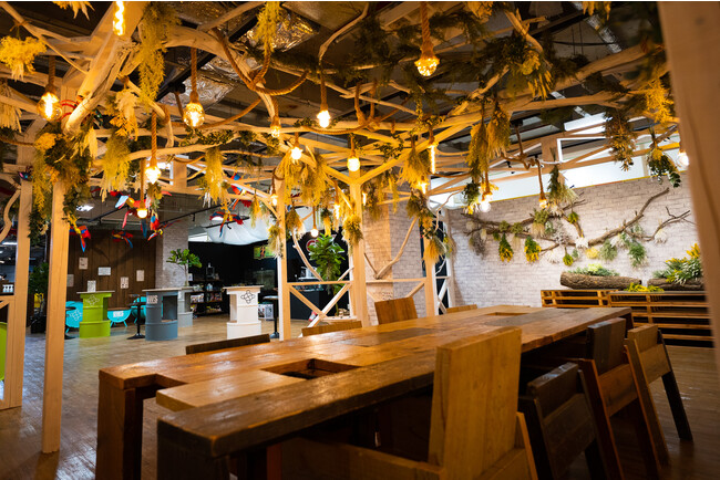 休憩や談笑ができるNARA IKIMONO MUSEUM 最後のゾーン「NIMキャンプ」。いきものに関する書籍が多く揃った「森の図書館」も併設しており、リラックスできる空間となっています。