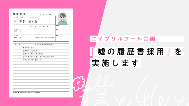 そんな中、エイプリルフールにちなみ、嘘をあえてついてもらうことで人柄やトーク力を判断する「嘘の履歴書採用」を二週間限定で実施することとなりました。たくさんのご応募をお待ちしています。
