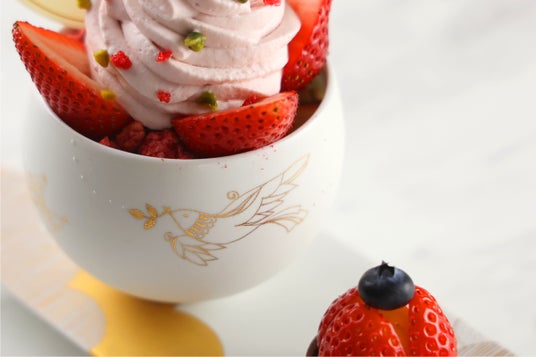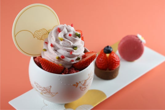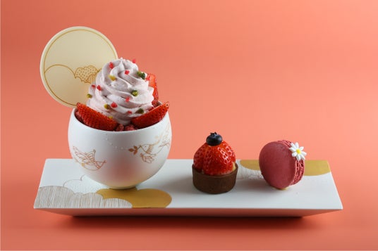 自社のアイスクリーム工房で作る苺ソルベやラズベリーの甘酸っぱさに、フレッシュな苺を飾り付け、ふんわりとローズが香るパフェ。特別に制作されたトレーには、たっぷりカスタードを詰め込んだ苺タルトと、可愛らしいラズベリーのマカロンを添えています。
