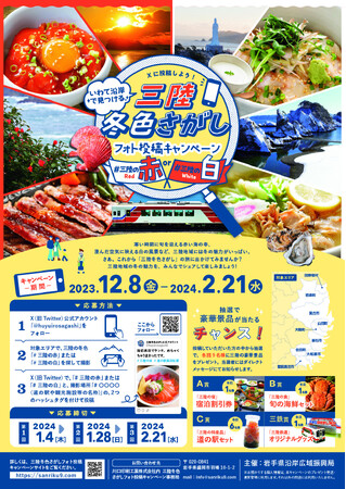 冬の岩手・三陸の魅力を発信するため、「赤」と「白」のカラーに着目した「三陸冬色さがし」をテーマとしたフォト投稿キャンペーンを実施します。冬の三陸で見つけた「赤いモノ」、「白いモノ」の写真を撮影し、「#三陸の赤」または「#三陸の白」と、撮影場所「#〇〇〇〇(道の駅や観光施設等の名称)」の、2つのハッシュタグをつけてX(旧Twitter)に投稿すると、写真を投稿した方の中から、抽選で三陸の宿泊施設の割引券をはじめとした豪華景品をプレゼントします。ぜひ、岩手・三陸にお越しいただき、キャンペーンにご参加ください!