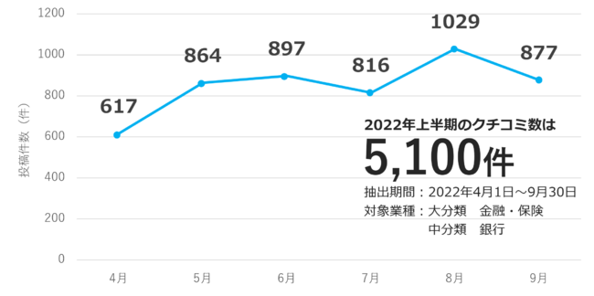 『ライトハウス』に寄せられた銀行のクチコミは、2022年上半期(4~9月)で5,100件にのぼります。職種別の投稿件数内訳を見ると、営業系が約55%を占める結果となりました。