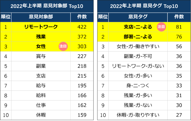 クチコミ中に出現する話題(意見対象部)及びフレーズ(意見タグ)別のランキングを見ると、意見対象部は1位 リモートワーク・2位 残業・3位 女性と続きましたが、意見タグは支店・部署によるという意見が上位となりました。支店・部署によって働き方の方針が異なることに言及しているクチコミが多く存在する可能性が見て取れました。