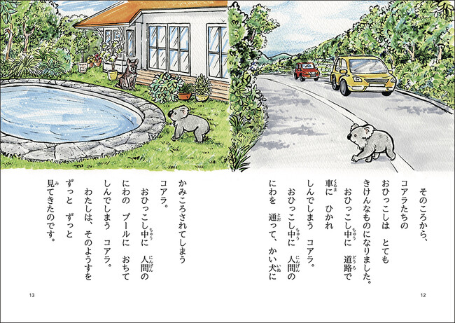 でも、人間が家や道路を作り、森はすがたをかえていきました。ある夜、危険な道路を渡ってコアラが私のところへ引っ越してきました。
