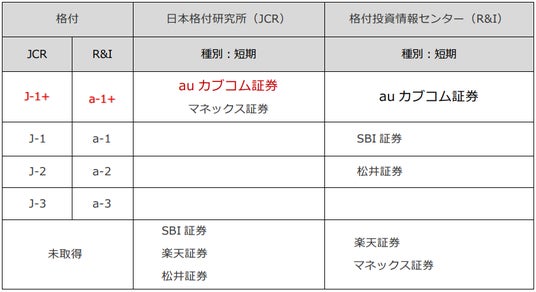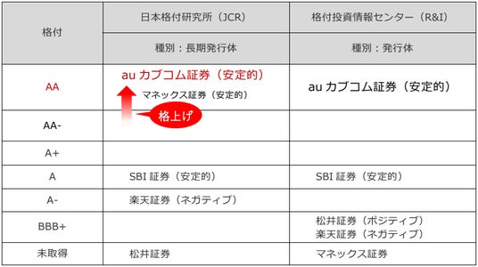 auカブコム証券株式会社(本社:東京都千代田区、代表取締役会長兼社長:二宮明雄、以下「auカブコム証券」)は、2024年10月25日、日本格付研究所(「以下、JCR」)による長期発行体格付が「AA-」から「AA」へと1段階引き上げとなったことをお知らせいたします。短期格付は最高水準の「J-1+」を維持しております。