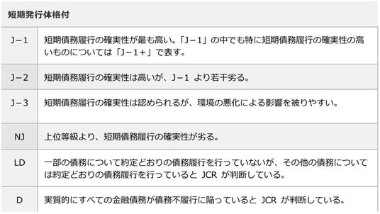AAからBまでの格付記号には同一等級内での相対的位置を示すものとして、プラス(+)若しくはマイナス(-)の符号による区分を付す。(出典:JCR)