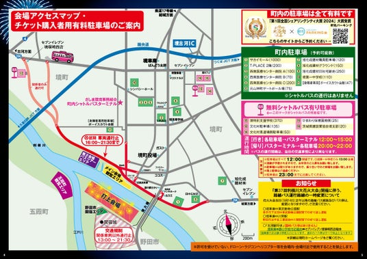 9月14日(土)16:00~21:30の時間帯で、一部道路・地区にて車両通行止めの交通規制が実施されます。安全なイベント運営のため、ご理解とご協力をお願い申し上げます。臨時バスおよび町内シャトルバスが運行されますが、有料観覧席・招待チケット保有者のみ乗車可能です。駐車場は予約制のため、詳細につきましては、「第37回利根川大花火大会」公式サイトの「アクセス」ページ(https://www.sakai-hanabi.com/access/ )でご確認ください。