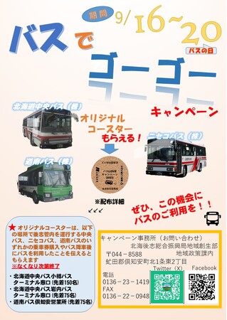 9月16日~20日まで、後志管内を運行する中央バス、ニセコバス、道南バスをご利用いただいた方に、先着でオリジナルコースターをプレゼントするキャンペーンを実施します。