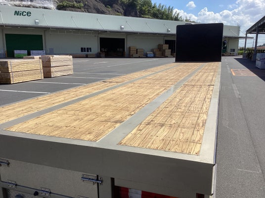 軽量かつ強度の高い「Gywood(R)」を施した素材をトラックの床板として活用しました。現在トラックの床板で多く用いられている南洋材「アピトン」は高い耐久性や強度を持つものの、2025年に施行される改正クリーンウッド法によって今後入手が困難になる可能性があることなどから、代替木材のニーズが高まりつつあります。表層圧密テクノロジー「Gywood(R)」により強度を高めたスギ大径木を活用することで、日本国内で素材の調達から加工まで行うことが可能となり、安定的な供給と国産材の利用拡大が見込めます。加えて、スギ本来の軽さを保つ「Gywood(R)」を施した素材への代替により、トラックの軽量化を図ることができます。これにより、ガソリンの使用量が削減されることで、運搬コストの削減や環境保全の効果が見込めます。今後、トラックやトレーラーにとどまらず、船舶やコンテナ、パレット、航空機などでの活用も期待できます。