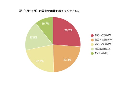 夏の電力使用量で最も多かったのは「150~250kWh」で26.2%、次点で「350~450kWh」23.3%、次いで「250~350kWh」22.3%と割れており、約7割の方が「150~450kWh以内」だったことが分かりました。