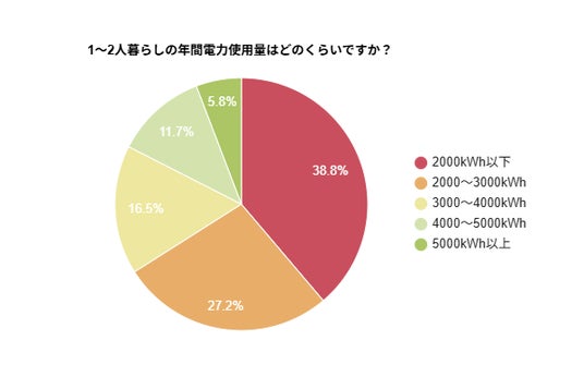1~2人暮らしの年間電力使用量で最も多かったのは、「2000kWh以下」が約4割でしたが、全体的に見ると「2000kWh以上」年間で電力を消費している世帯が約6割に及んでいることが明らかになりました。