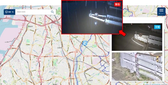 もちろん登録されたカメラ画像の一括閲覧も可能。生成AIによる事象検知により冠水などを自動検知してシステムと管理者に通知されます。