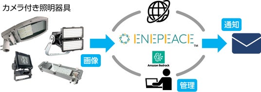 新しく開発された「クラウド型自動監視システム」は、岩崎電気製のカメラ付き照明器具(※3)と「ENEPEACE」、さらに「Amazon Bedrock(アマゾン ベッドロック)」の生成AI技術を基盤としています。