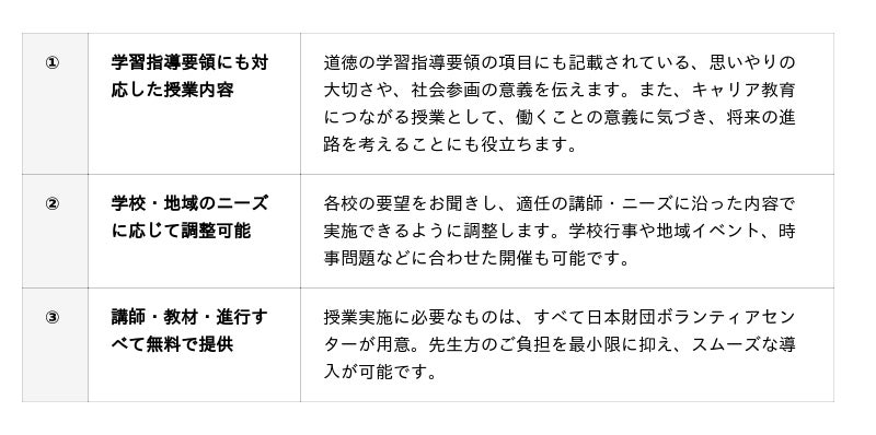 ボランティア経験者が講師として学校を訪問し、自身の体験談や映像などを用いながら、ボランティアの魅力やその楽しさ、社会的な意義を伝えます。