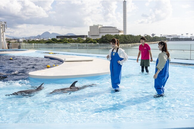 「ドルフィンウォーク」は、実際にイルカが泳いでいるプールの浅瀬部分にお客様が入って、イルカたちをより身近に感じていただける体験プログラムとして、7月22日(土)から8月27日(日)までの期間限定で実施しました。