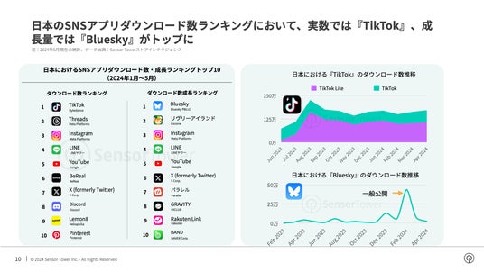 『Bluesky』は、招待制を廃止して一般に公開した後、日本におけるダウンロード数が急増しました。この結果、2024年1月から5月までの間に、日本でダウンロード数が最も増加したSNSアプリになっています。