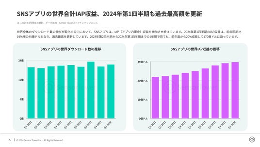 ショート動画の流行およびマネタイズモデルの随時更新に伴い、SNSアプリの収益が世界的に増加し続けています。2024年第1四半期にSNSアプリの世界合計IAP収益が45億ドルに達しています。これは前年同期から19%増加で、過去最高を更新となりました。