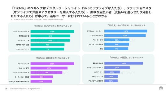 Sensor TowerのAudience Insightsのデータによると、『TikTok』は比較的若年層に支持されており、2024年第1四半期のアメリカにおける2000年以降生まれのユーザーの割合は36%であり、『Facebook』の14%より著しく高くなっています。『TikTok』のペルソナは、デジタルソーシャライト(SNSでアクティブな人たち)、ファッショニスタ(オンラインで洋服やアクセサリーを購入する人たち)、柔軟な支払い者(支払いを遅らせたり分割したりする人たち)が中心であり、若年ユーザーに好まれていることがわかります。