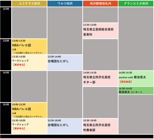 出演アーティストとして、所沢を本拠とし、昨年創立30周年を迎えた埼玉で唯一のバレエ団である「NBAバレエ団」、日本大学芸術学部出身で、YouTube登録者が70万人を突破したピアニスト 「菊池亮太」さんをはじめ、「合唱団なにがし」、「埼玉県立芸術総合高等学校音楽科」、「埼玉県立 所沢北高等学校ギター部」、「埼玉県立所沢北高等学校吹奏楽部」の皆さまに決定。さらに、NBA バレエ団はワークショップ、菊池亮太さんはセッションを通じて、一般のお客様にも参加していただくことで、共に街を音で包み込めるようなコンテンツをご用意しております。