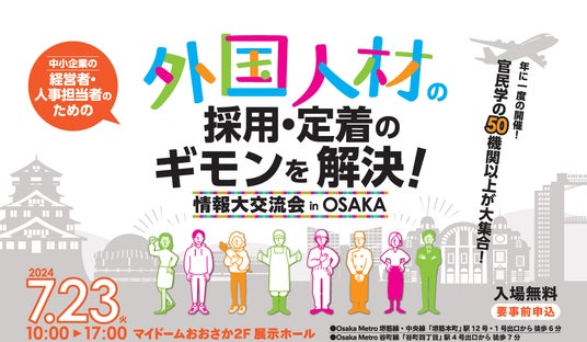 中小企業における「外国人材」の採用に関する相談からマッチングまでをワンストップでサポートする「大阪外国人材採用支援センター」は、7月23日(火)に「中小企業の経営者・人事担当者のための外国人材情報大交流会inOSAKA」を開催します。