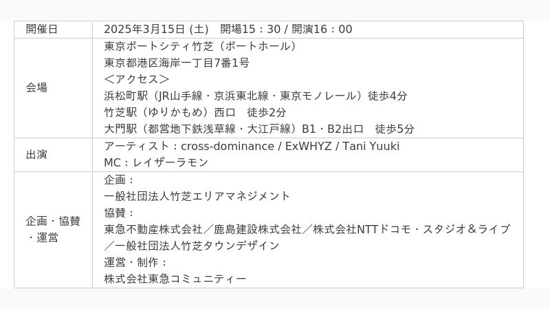 竹芝エリアに春を告げる本イベントは、最新の音楽シーンを創りだすフェス形式のイベントです。出演アーティストに「cross-dominance」「ExWHYZ」「Tani Yuuki」のほか、MCにお笑い芸人の「レイザーラモン」を迎え、ライブやトークセッション等のプログラムを予定しています。