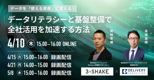データリテラシーの向上を通じてデータドリブンカンパニーへの変革を支援する株式会社デリバリーコンサルティング(本社:東京都港区、取締役CEO:内藤 秀治郎)は、DXプラットフォームサービス「Reckoner(レコナー)」を提供する株式会社スリーシェイク(本社:東京都新宿区、代表取締役社長:吉田 拓真)と共催でWEBセミナーを開催いたします。