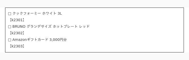 ・本キャンペーンについてtimy作業予約ページにアクセスして、洗車・オイル交換・コーティングのいずれかのメニューを選択し、応募する景品のキャンペーンコードを入力(●クックフォーミー ホワイト 3L 【k2301】 ●BRUNOグランデサイズホットプレートレッド【k2302】 ●Amazonギフトカード3,000円分【k2303】)して予約をしてください。※予約後に店舗で作業を実施した方のみが対象になります。※本キャンペーンは予告なく終了する場合があります。あらかじめご了承ください。