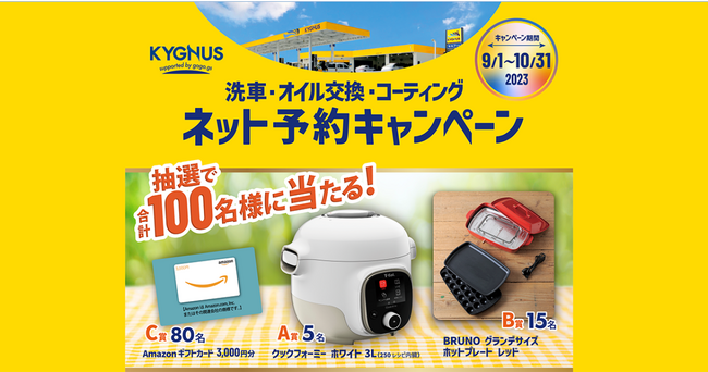 キグナスの対象店舗で、期間中に【洗車・オイル交換・コーティング】をネット予約・作業実施完了された方の中から、抽選で景品が当たる!