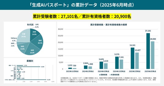 2025年6月1日(日)~6月30日(月)に開催した「2025年6月 生成AIパスポート試験」の受験者数は10,759名、そのうち合格者数は8,300名、合格率は77.14%という結果になりました。また、2025年6月時点の生成AIパスポートの累計受験者数は27,101名、累計有資格者数は20,900名になりました。