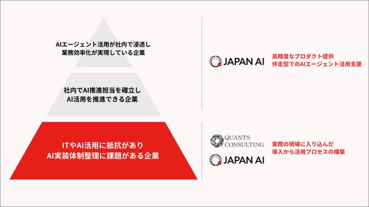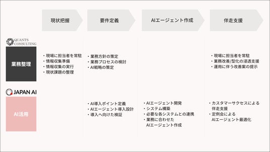 JAPAN AIが提供する「JAPAN AI AGENT + AI活用伴走支援」と、クオンツ・コンサルティングが提供する「伴走支援型業務効率化コンサルティング」を融合することで、これまでAI活用推進が困難であった企業においても、効果的なAI実装体制の構築が可能になります。