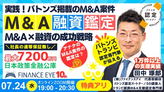 7月24日開催|日本で唯一のM&A×融資の専門家が伝えるM&A融資が成功する案件とは?買収資金は連帯保証ナシ最大7200万円の公庫を活用~BATONZ認定・TRANBI提携のファイナンスアイの田中琢郎