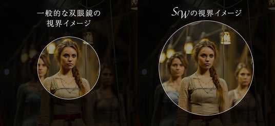新型双眼鏡「SW」の最大の特長は、超広角な視界を保ちながら、覗きやすさを実現した点です。