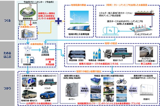 今治市は、日本環境技研株式会社を実証代表者とする事業に、愛媛県繊維染色工業組合、四国ガス株式会社、株式会社タクマ、三浦工業株式会社、明治電機工業株式会社とともに共同実施者として参画し、愛媛県をオブザーバー、株式会社今治.夢スポーツ、トヨタ紡織株式会社、日本特殊陶業株式会社、株式会社ミライト・ワンを協力者として連携のもと、「愛媛県今治市における地域産業と観光業による水素サプライチェーン構築及び付加価値創出に関する調査」(以下、「本事業」)を開始します。この事業は、環境省が公募した「令和7年度コスト競争力強化を図る再エネ等由来水素サプライチェーンモデル構築・FS※1事業」の採択事業です。