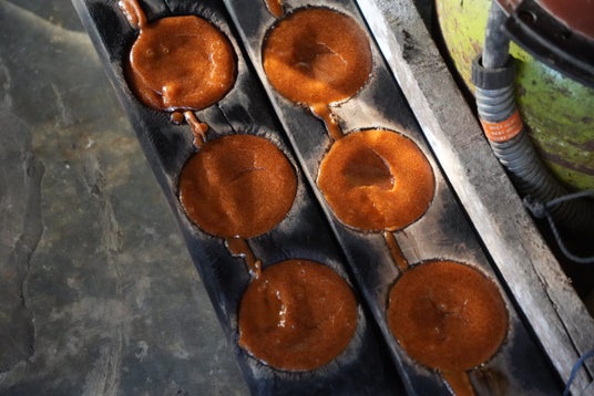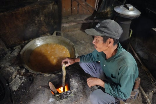 採取された樹液からパームシュガーの原料となる粗糖をつくる煮詰めて濃縮するプロセス