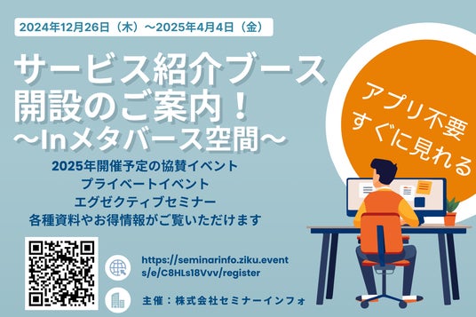 株式会社セミナーインフォ(本社:東京都千代田区 代表:小西 亘)は、2024年12月26日(木)から2025年4月4日(金)まで金融業界向けサービス資料の展示会を、メタバース空間で開催いたします。