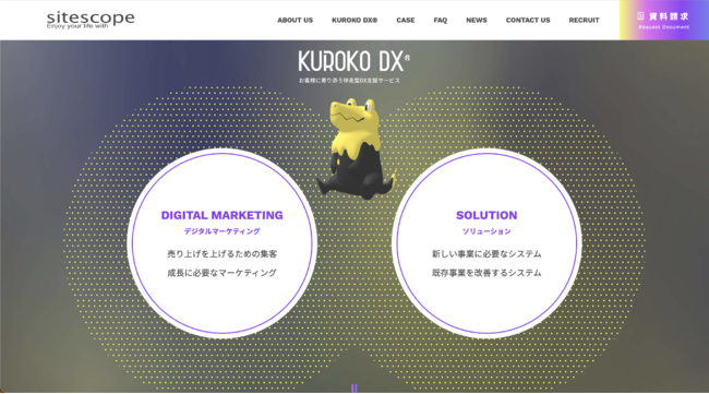 「KUROKO DX(R)︎」のサービス概要、さらに「デジタルマーケティング」や「ソリューション」などの詳しい説明を加え、サイトスコープができることが分かりやすくより明確になりました。