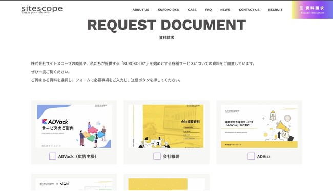 会社概要をはじめ、サイトスコープが提供する「KUROKO DX(R)︎」、「ADVack」、「ADViss」、「Skai(旧Kenshoo」)、「ADVell」、「システム開発ソリューション」のサービス資料がダウンロードできます。
