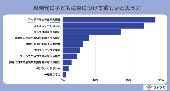 AIが普及している今だからこそ身につけてほしいスキルについて尋ねた結果、第1位は「アイデアを生み出す創造性」(28.3%) 、第2位は「自分の考えを他者にわかりやすく伝えるコミュニケーション力」(24.8%)、第3位は「自ら学び成長する力」(17.7.%)でした。