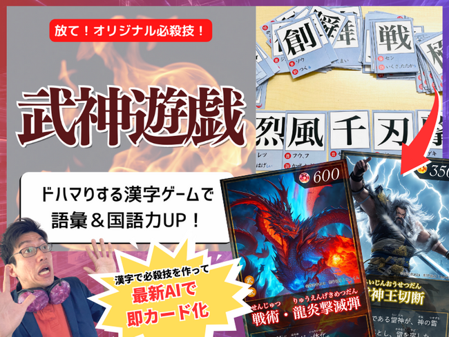 「漢字」がテーマの超おもしろゲームで遊んで、自然と漢字を学んじゃいましょう!授業後半には、ゲームで作った必殺技を、最新AI「Chat GPT-4.0」と画像生成AI「DiffisionBee」によって美麗イラストに仕上げる過程を体験します!授業では、「漢字=何度も書かされる嫌なもの」という先入観をくつがえし、「漢字だけど楽しい!こんなにおもしろい学び方があるんだ!」と子どもが気付くきっかけを得ることをねらいとしています。また、最新AIを駆使して、できた必殺技をプロクリエイターが作成したような美麗イラストにすることで、漢字に愛着を持ち、記憶の定着率を劇的に向上させていきます。