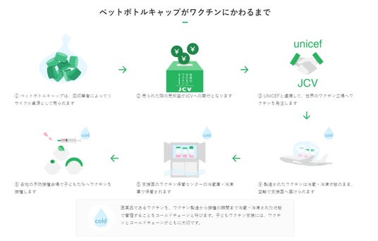 2005年に回収運動が始まり、誰もが参加しやすいチャリティ活動として、多くの方々に参加していただいているのが、ペットボトルキャップ回収による子どもワクチン支援活動です。キャップを集めて、JCVと連携する回収・リサイクル事業者やスーパーマーケットなどにお持ち込みいただくと、その売却益の一部がワクチンに換わり、途上国の子どもたちに寄付されます。