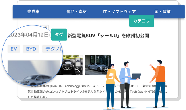 個別ニュースについているタグをクリックすると、検索せずともニュースを絞り込めます。主要メーカー名や部品名に加え、主要国の政策や台数などの軸で絞って最近の動向を把握できます。