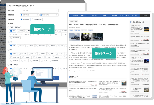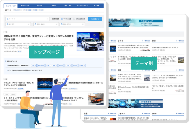 電気自動車(EV)や自動運転などのトレンドワードに加え、自動車メーカーや部品サプライヤー別でニュースを掲載します。一覧ページではテーマの全体像を、クリックすると特定テーマのニュースのみを確認できます。