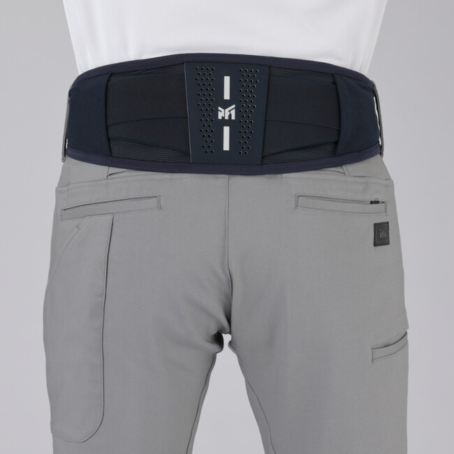 下腹部をしっかり締めることで腹圧を高める効果があり、機能性の高さからプロからアマチュアゴルファーまで、ティーショットからパッティングまで常に腰をホールドし、最終ホールまでベルトがズレにくいとの高評価を得ています。また腰部への負担が軽減し、安定したサポートが得られるため、思い切ったスイングができるといった声や、ラウンドの後半も疲れにくくなったといった副次効果も評価をいただいています。腰の悩みや不安から、ゴルフが楽しめない、というストレスを解消し、いつまでも好きなゴルフを続けるための「腰部保護ベルト一体型ゴルフパンツ」が、MIDORI PF1です。