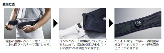 骨盤位置に装着することで腰への負担を軽くします。さらにダイヤル式でワンタッチで「締める」「緩める」の調節が瞬時にできるBOA(R)フィットシステムを搭載。ベルトを外すことなくシーンや体調に合わせてフィット感を調節できます。