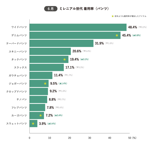 ボトムスの内パンツに関しては、「ワイドパンツ」「デニムパンツ」の人気が継続している傾向で、着用率が45.4%~48.4%と最も高く、ミレニアル世代女性の約2人に1人が着用しています。ウエスト部分にタックが入っていることで腰回りがゆったりとする「タックパンツ」や、トレンドアイテムの「カーゴパンツ」のように動きやすく履き心地の良いパンツが前年同時期と比較して▲3.1%~3.4%増加しています。