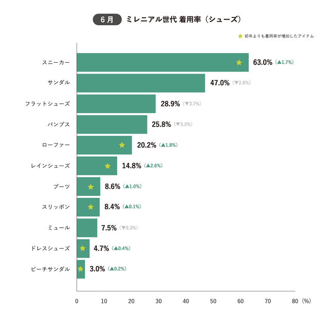 シューズに関しては「スニーカー」の着用率が63.0%と最も高く、ミレニアル世代女性の約1.5人に1人が着用しています。「フラットシューズ」「パンプス」のようにお仕事にも使えそうな綺麗めのシューズは、前年同時期と比較して着用率が▼3.3%~▼3.7%減少傾向であることが分かりました。