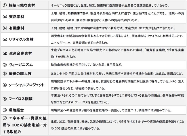 販売する商品は、独自に掲げた7つの「サステナブル」の各要素に該当する商品を全国から取り寄せました。※商品は随時追加してまいります。