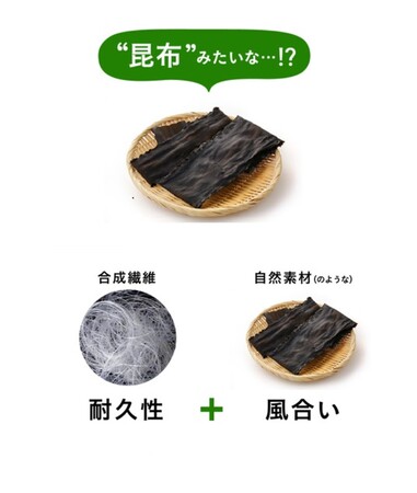 当社が誇る、特殊加工技術を使った高性能ナイロン生地で、名前の通り、昆布のような「ナチュラルでドライな風合い」が特徴の素材です。硬度からくる自立性があり、驚くほどの軽さと強さが特徴です。