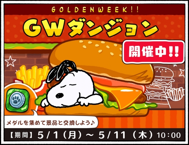 5/1(月)~5/11(木)10時までの期間中、『スヌーピードロップス』ゲーム内で、ハンバーガーに挟まれている、とても珍しいデザインのスヌーピーが登場するイベントを開催します。